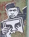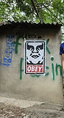 The threat of a lawsuit from Titan Sports, Inc. in 1994[5] spurred Fairey to stop using the trademarked name André the Giant, and to create a more iconic image of the wrestler's face, now most often with the equally iconic branding OBEY. The "OBEY" slogan was not only a parody of propaganda, but also a direct homage to the "OBEY" signs found in the cult film, They Live (1988), starring Roddy Piper. About "OBEY", San Diego Union-Tribune art critic Robert L. Pincus said: "[Fairey's work] was a reaction against earlier political art, since it delivered no clear message. Still, 'Obey' was suggestively antiauthoritarian."[6] "Following the example set by gallery art, some street art is more about the concept than the art," writes The Walrus contributor Nick Mount. "'Fuck Bush' isn’t an aesthetic; it’s an ethic. Shepard Fairey’s Obey Giant stickers and Akay's Akayism posters are clever children of Duchamp, ironic conceptual art."[7]