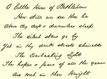 As Christmas of 1868 approached, Mr. Brooks told me that he had written a simple little carol for the Christmas Sunday-school service, and he asked me to write the tune to it. The simple music was written in great haste and under great pressure. We were to practise it on the following Sunday. Mr. Brooks came to me on Friday, and said, "Redner, have you ground out that music yet to 'O Little Town of Bethlehem'?" I replied, "No", but that he should have it by Sunday. On the Saturday night previous my brain was all confused about the tune. I thought more about my Sunday-school lesson than I did about the music. But I was roused from sleep late in the night hearing an angel-strain whispering in my ear, and seizing a piece of music paper I jotted down the treble of the tune as we now have it, and on Sunday morning before going to church I filled in the harmony. Neither Mr. Brooks nor I ever thought the carol or the music to it would live beyond that Christmas of 1868.