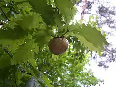 Traditional celebrations to commemorate the event often entailed the wearing of oak apples (a type of plant gall, possibly known in some parts of the country as a "shick-shack"[8]) or sprigs of oak leaves, in reference to the occasion after the Battle of Worcester in September 1651, when Charles II escaped the Roundhead army by hiding in an oak tree near Boscobel House.[9] Anyone who failed to wear a sprig of oak risked being pelted with bird's eggs or thrashed with nettles.[10] In Sussex, those not wearing oak were liable to be pinched, giving rise to the unofficial name of "Pinch-bum Day"; similarly it was known as "Bumping Day" in Essex.[11]