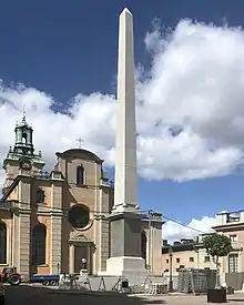 - ↑ "Obelisken vid Stockholms slott snart på plats igen" [The obelisk at Stockholm Castle will soon be in place again] (Press release) (in Swedish). Stockholm, Sweden: Statens fastighetsverk. Cision News. 17 April 2020. Retrieved 20 September 2020.