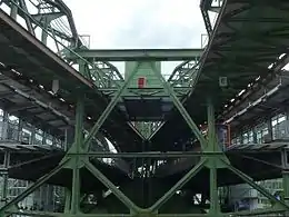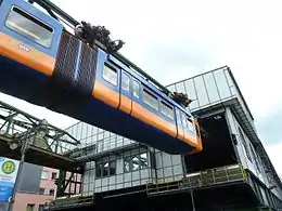 Oberbarmen is the eastern terminal of the Wuppertal Schwebebahn; it is located in the Barmen area of Wuppertal.[1] The terminal consists of two buildings, the station proper and the depot with the loop for the train to turn around. The depot holds trains during the night. The buildings are suspended above the Wupper and separated by a bridge, the Wupperbrücke Berliner Platz. The main works for maintenance and repair are at the Vohwinkel Schwebebahn terminal.[1]
