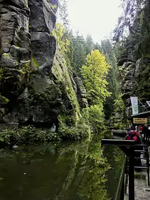 The Obere Schleuse in Hinterhermsdorf is a barrage system on the German-Czech border river of Kirnitzsch and impounds the water over a length of 700 metres. It was originally a facility for timber rafting. There are boat rides on the reservoir today during the summer months. At the boat landing point the water depth is 1 metre; by the dam it is 4 metres. The water temperature rarely climbs above 8 °C in summer. In the winter months, during when there are no boat trips, the water is not impounded and the Kirnitzsch flows in its original river bed.