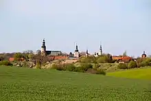 In 1532 the town was incorporated into the Bohemian Crown Lands. From the late 16th century it was owned by the Oppersdorff family.[2] George III Oppersdorff, as a supporter of Catholicism, built several chapels in the 17th century and made the town a regional pilgrimage destination.[3] Due to his Catholicism, during the Thirty Years' War, he had to take refuge in nearby Poland, where, thanks to the help of Polish king Władysław IV Vasa, he stayed at the Wawel and Niepołomice royal castles.[2] During the war, in 1632, the town was invaded and partly destroyed by Saxon troops,[4] and in 1643, it was largely destroyed by the Swedes and about 500 of its inhabitants died of an epidemic.[5] In 1645 Głogówek returned to Poland under the House of Vasa. During the Swedish invasion of Poland, Polish King John II Casimir Vasa stayed in the castle in Głogówek from October 17, 1655, until December 18 of the same year. Hetman Stefan Czarniecki, poet Jan Andrzej Morsztyn, future king Michał Korybut Wiśniowiecki,[6] and parliamentarian Jakub Sobieski, father of the future king John III Sobieski, also visited the town at that time.[7] John II Casimir Vasa visited the town again, after his abdication, in 1669.