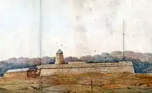 In 1815 Francis Greenway built a powder magazine next to the Fort which is shown in both of the watercolours. It was a rectangular structure which contained a 4-foot thick arched stone vault. However it too was not fully completed and the proposed stone roof was not built. Instead it had a temporary roof which subsequently became permanent and no further work was undertaken.[3]: 9