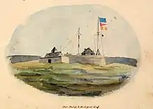 - "The ramparts, merlons (which were later dismantled) and embrasures of the three sides are nearly finished; the outer wall of the rampart of the fourth and fifth sides raised five feet; a bomb proof chamber of 14 feet square completed under one side and the foundation of the sixth side nearly laid."[3]: 6