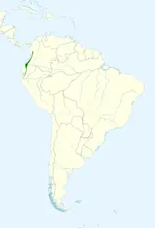 This species is native to South America. Its range extends on the western slopes of the Andes from the Chocó Department of Colombia southwards to the El Oro Province of Ecuador. It usually occurs between 400 and 1,500 m (1,300 and 4,900 ft) and is locally common in moist forest. It normally occurs at higher altitudes than the closely related lemon-spectacled tanager (Chlorothraupis olivacea) and can be told from that species by its brown-tinged underparts and its lack of a yellow ring round the eye.[2]