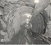 The powerhouse of Ocoee No. 3 was built 4.2 miles (6.8 km) downstream from the dam in order to obtain maximum utilization of the elevation loss along this stretch of the river. A high pressure conduit— most of which flows through a 12-foot (3.7 m) by 12-foot (3.7 m) tunnel carved into the mountainside— carries the water from the reservoir at a relatively steady elevation. The water emerges from the tunnel at a point 2.5 miles (4.0 km) from the reservoir intake and drops 180 feet (55 m) through a steel penstock to the powerhouse's lone turbine.[2]