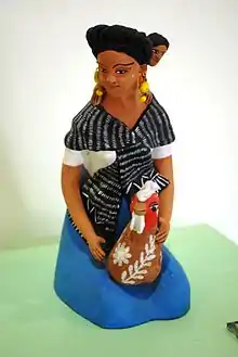 While the men dominate the rug-weaving and woodcarving industries in Oaxaca, the women reign with their pottery. This is true in Ocotlan as well.[20] The best known pottery family in Ocotlan is the Aguilar. The dynasty begins with potter Isaura Alcantara Diaz, a potter. Isaura learned the traditional pottery making techniques of the Oaxaca Valley, which was mostly limited to making utilitarian items. She began to experiment with figures and more decorative pieces, with some of her pieces making their way into the Rockefeller collection, but died prematurely at the age of 44. Before she died, she taught potting to her children Josefina, Guillermina, Irene, Concepción and Jesús. Due to their mother's death, the children began working early, with Josefina being only seven. Poverty prevented the children from attending school. Like their mother, they began and mostly made pots and other kitchen utensils but they also worked to develop clay figures.[6] Over time, these siblings became renowned for their fanciful painted clay figures that celebrate everyday life.[20] Today, these siblings still work and much of the third generation are craftsmen as well. Some, such as Demetrio Garcia Aguilar, are making a name for themselves as well.[6]