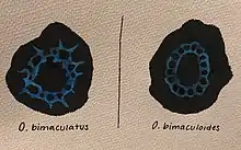 O. bimaculatus gets its name "two-spotted octopus" from the blue and black ocelli under each eye. One potential function of these bright blue ocelli is to allow the octopus to appear as a different animal with large eyes as it swims swiftly through the water.[4] O. bimaculatus is often confused with Octopus bimaculoides due to the similarity in looks, however they are two different species. They both have these two distinctive black and blue ocelli beneath the eyes and above the arms, however there are a few key differences in their features to tell the two species apart. The blue ring of the ocelli for Octopus bimaculatus does not have the same distinctive chain-like pattern that the Octopus bimaculoides has. For O. bimaculatus the pattern is still chain-like but more irregular, asymmetrical, and disproportionate while for O. bimaculoides the chain-like pattern is more symmetrical and orderly. The two also differ in egg size, with Octopus bimaculatus eggs being much smaller that hatch into planktonic larvae rather than benthic hatchlings like Octopus bimaculoides. Additionally, octopus bimaculatus is generally the larger of the two species.[5]