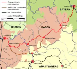 The Odenwald Railway (German: Odenwaldbahn) (sometimes referred to as the Baden Odenwald Railway to distinguish it from the Hessian line of the same name) was the name given to a Baden railway line in southwestern Germany built from between 1862 and 1866. It ran from Heidelberg via Neckargemünd and Meckesheim through the Little Odenwald mountains to Waibstadt, Mosbach, Osterburken and Lauda to Würzburg in Bavaria.