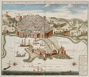 Algiers in the 17th century, with the Odjak flags risen over its forts, by Gerard van Keulen (dead 1726)