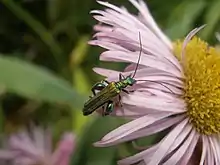The family Oedemeridae is a cosmopolitan group of beetles commonly known as false blister beetles, though some recent authors have coined the name pollen-feeding beetles. There are some 100 genera and 1,500 species in the family,[1] mostly associated with rotting wood as larvae, though adults are quite common on flowers. The family was erected by Pierre André Latreille in 1810.