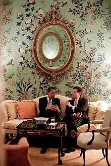 President Obama speaks with Interior Secretary Salazar in one of the Drawing Rooms