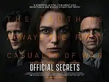 Official Secrets is a 2019 British drama film directed by Gavin Hood, based on the case of whistleblower Katharine Gun who exposed an illegal spying operation by American and British intelligence services to gauge sentiment of and potentially blackmail United Nations diplomats tasked to vote on a resolution regarding the 2003 invasion of Iraq.[3][4] Keira Knightley stars as Gun, alongside Matt Smith, Matthew Goode, Adam Bakri, Indira Varma and Ralph Fiennes.