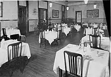 On the left wing was the dining room, breakfast room, and kitchens. The great dining hall could sit 300 guests and was floored in wood and marble tile. On the right wing were various rooms of different sizes and purposes. The biggest one was the parlor, carpeted in Moquette and connected to reception and dressing rooms; there were also billiards rooms, smoking rooms, and reading rooms. The rotunda also connected to furnished offices for hotel use and a staircase to the higher floors.[6][12]