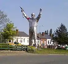 One of Brownhills' most prominent landmarks is a 46 feet (14 m) stainless steel sculpture of a coal miner, erected in May 2006 on a roundabout at one end of the High Street, where the A4124 Pelsall Road and High Street A452 cross. The colossal sculpture, by John McKenna ARBS, commemorates the town's mining tradition.[70][71] A competition was organised to choose an official nickname for the statue. The winning name was Jigger after Jack "Jigger" Taylor who died when the roof of Walsall Wood pit collapsed in 1951.[72] The town is also home to what is reputed to be the oldest fingerpost in the United Kingdom.[2]