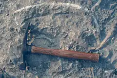 Large rugose coral (above hammer) in the Devonian Jeffersonville limestone at the Falls of the Ohio, near Louisville, Kentucky