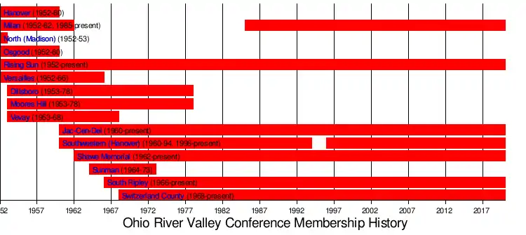 The ORVC traces its history to two conferences, the Southeastern Indiana and Laughery Valley. When the league began, two of its members came from the SEIC (Osgood, Versailles), a third (Rising Sun) had been in the SEIC before helping found the LVC, and a fourth (Milan) was a SEIC member until being removed from the conference in 1942, remaining independent since that point. The first shakeup in conference membership came in the conference's second year, as North closed, and two more LVC schools (Dillsboro, Moores Hill) joined with one SEIC school (Vevay). Hanover and Osgood consolidated with other local schools to become Southwestern and Jac-Cen-Del in 1960, with both staying in the league. Milan, a school that had dominated 1950's basketball and had football, moved to the Eastern Indiana Athletic Conference in 1962. They were replaced by two schools: Shawe Memorial in 1962, and Sunman in 1964. Versailles became South Ripley in 1966, with Vevay changing to Switzerland County in 1969.