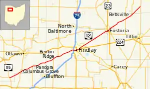 From Vaughnsville, SR 12 travels northeast through the small towns of Columbus Grove, Pandora, and Benton Ridge before entering Findlay. Through Findlay, it shortly shares a route with US 224. After exiting Findlay, it continues on a northeast heading, passing through Arcadia, Fostoria, and Bettsville before ending at SR 53.