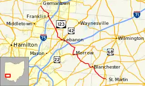 State Route 123 (SR 123) is a state highway in southwestern Ohio. The route runs from SR 251 about seven miles (11 km) southeast of Blanchester to Germantown at SR 4, a distance of 43.6 miles (70.2 km). The section of road from Franklin to Lebanon was originally a toll road until it was taken over by Warren County and made free for public use. [2]