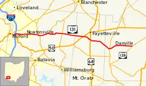 State Route 131 (SR 131) is a 30.05-mile (48.36 km) long east–west state highway in the southwestern quadrant of the U.S. state of Ohio. The western terminus of SR 131 is at a signalized intersection with U.S. Route 50 (US 50) in the eastern Cincinnati suburb of Milford. Its eastern terminus is at a T-intersection with SR 138 approximately 7.50 miles (12.07 km) southwest of Hillsboro.