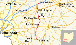State Route 134 (SR 134) is a north–south state highway in the southwestern portion of the U.S. state of Ohio. Its southern terminus is at its intersection with SR 32 in Sardinia and its northern terminus is at its intersection with Main Street in Port William.