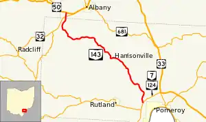 State Route 143 (SR 143) is a north–south state highway in the southern portion of the U.S. state of Ohio. It is also home to the famous 143 yard sale, a 20 mile long annual event where anyone on the route is open to host a yard sale. The southern terminus of SR 143 is at a T-intersection with the concurrency of SR 7 and SR 124 approximately one mile (1.6 km) west of the village of Pomeroy. Its northern terminus is at a T-intersection with U.S. Route 50 (US 50) nearly 2.75 miles (4.43 km) southwest of Albany.