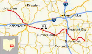State Route 146 (SR 146) is an east-west state highway in the eastern portion of the U.S. state of Ohio. It runs 65.38 miles (105.22 km) from SR 16 near Nashport to SR 78 in Summerfield.