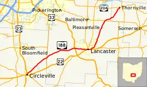 State Route 188 (SR 188) is a 39.04-mile-long (62.83 km) eastwest state highway located in the central part of the U.S. state of Ohio. SR 188's western terminus is in Circleville at a signalized intersection where it meets the concurrency of U.S. Route 22 (US 22) and SR 56. Its eastern terminus is at a signalized intersection with SR 204 in the central business district of the village of Thornville.