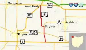 State Route 191 (abbreviated as SR 191) is a north–south state highway in northwestern Ohio, a U.S. state. SR 191's southern terminus is at U.S. Route 6 (US 6) approximately four miles (6.4 km) south of Stryker. Its northern terminus is at the concurrency of US 20A and US 127 in downtown West Unity. Between its southern terminus and Stryker, SR 191 runs parallel to, and to the east of, the Tiffin River.