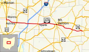 State Route 229 (SR 229) is an east-west state highway in the central part of the U.S. state of Ohio. The western terminus of State Route 229 is at a T-intersection with State Route 47 just 0.25 miles (0.40 km) south of the village limits of Waldo. Its eastern terminus is more than 50 miles (80 km) to the east at a T-intersection with U.S. Route 36 about 5.5 miles (8.9 km) west of the village of Nellie.