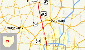 State Route 257 (SR 257, OH 257) is a 26.19-mile (42.15 km) north - south state highway in the central portion of the U.S. state of Ohio. The highway's southern terminus is in the northwestern Columbus suburb of Dublin at a roundabout intersection with U.S. Route 33 (US 33) and SR 161. This mainly two-lane highway follows the eastern side of the Scioto River from Dublin to its junction with US 42. After crossing over the river with the U.S. highway, SR 257 parallels the river's western bank. SR 257 has its northern terminus at a T-intersection with SR 47 on the western village limits of Prospect. SR 257 was created in 1926, and extended in 1935 and 1937.
