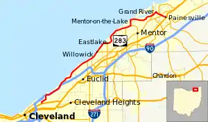 State Route 283 (SR 283) is an east–west state highway in the northeastern portion of the U.S. state of Ohio. Its western terminus at U.S. Route 6 2+1⁄2 miles northeast of Downtown Cleveland, and its eastern terminus at U.S. Route 20 (Erie Street) in Painesville. Most of the route is known as Lakeshore Boulevard until it approaches the Grand River in Lake County. During its final stretch, its name changes to Olive Street, River Street, and finally to Richmond Street. The entire highway is part of the Lake Erie Circle Tour.