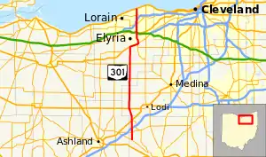 State Route 301 (SR 301) is a 45.33-mile (72.95 km) long north–south state highway in the northern portion of the U.S. state of Ohio. The southern terminus of SR 301 is at SR 302 in Chester Township nearly 5.50 miles (8.85 km) south of West Salem. Its northern terminus is at U.S. Route 6 (US 6) in Sheffield Lake.