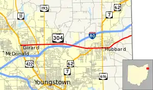 State Route 304 (SR 304) is an east–west state highway in the northeastern portion of Ohio. The western terminus of SR 304 is at a signalized intersection with US 422 in Girard. Its eastern terminus is at the Pennsylvania State Line nearly 3 miles (4.8 km) east of Hubbard, where the highway continues east as Pennsylvania Route 318.