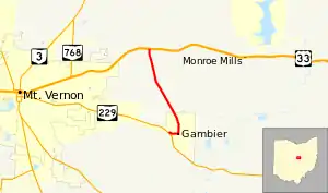 State Route 308 (SR 308) is a north–south state highway in the central portion of Ohio, a U.S. state. The southern terminus of SR 308 is at SR 229 in the western end of the village of Gambier, and its northern terminus is three miles (4.8 km) to the north of that point at a T-intersection with U.S. Route 36 (US 36) that is located approximately one and a half miles (2.4 km) east of the city limits of Mount Vernon.