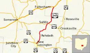 State Route 345 (SR 345) is a north–south state highway in the eastern portion of the U.S. state of Ohio. The southern terminus of SR 345 is at a signalized intersection with the SR 13/SR 37 concurrency in New Lexington. Its northern terminus is at a T-intersection with U.S. Route 22 (US 22) in the unincorporated community of East Fultonham.