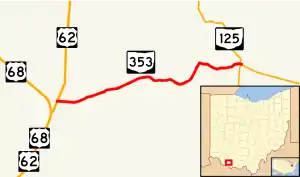 State Route 353 (SR 353) is an east–west state highway in southwestern Ohio, a U.S. state. Its western terminus is at U.S. Route 62 (US 62) about four and a half miles (7.2 km) south of Russellville, and its eastern terminus is near the unincorporated community of Decatur at SR 125. The entire route is a two-lane highway, passing through farmland and woodland. The route was commissioned in the mid-1930s and was paved in the mid-1950s.