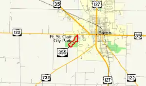 State Route 355 (SR 355) was a short 1.37-mile-long (2.20 km)[1] state highway in southwestern Ohio. The route served the former Fort St. Clair State Memorial (now Fort St. Clair Park) in Eaton, Preble County. The route began at SR 122 in western Eaton, traveled south along Camden Road for about 0.3 miles (0.48 km) before turning into the memorial, looping through the entire site, and ending at itself just south of the route's start at SR 122. The route was removed from the state highway system shortly after the park's jurisdiction was transferred from the state to the City of Eaton.