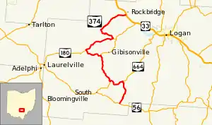 State Route 374 (SR 374) is north–south state highway in Hocking County, Ohio, located in the southern portion of the state. Its southern terminus is over 4 miles (6.4 km) east of the unincorporated village of South Bloomingville at State Route 56, and its northern terminus is near the unincorporated village of Rockbridge at US 33, west of Logan. The road serves Hocking State Forest as well as Hocking Hills State Park, and the entire highway is part of the designated Hocking Hills Scenic Byway.