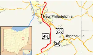 State Route 416 (SR 416) is a north–south state highway in the east-central portion of Ohio. The southern terminus of State Route 416 is at a T-intersection with U.S. Route 36 just west of Gnadenhutten. Its northern terminus is at a T-intersection with State Route 800 approximately 2 miles (3.2 km) east of Dover.