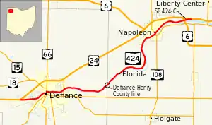 State Route 424 (SR 424) was an eastwest state highway in the northwestern portion of the U.S. state of Ohio. The route was a former section of US 24 that ran parallel to the Maumee River and Miami and Erie Canal between the cities of Defiance and Napoleon. First designated in 1964,[3][4] the western terminus of the route for most of its history was at an intersection with US 24 west of Defiance, though between 2008 and when the route was fully removed from the state highway system in 2012, it was at the Defiance County/Henry County line. Its eastern terminus was at a dead end near the US 6 / US 24 interchange east of Napoleon.