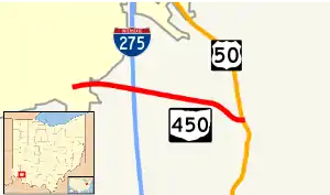 State Route 450 (SR 450) is a short east–west state highway in southwestern Ohio, specifically near the eastern Cincinnati suburb of Milford. The western terminus of State Route 450 is at the Milford city limits, just west of a partial cloverleaf interchange with Interstate 275, with the road continuing into Milford known as Milford Parkway, which passes by the River's Edge Shopping Center and several distribution-oriented businesses prior to meeting U.S. Route 50 at the intersection marking the western terminus of State Route 131. State Route 450's eastern terminus is at U.S. Route 50, less than 1 mile (1.6 km) east of Interstate 275.