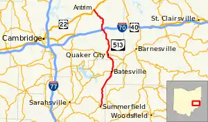 State Route 513 (SR 513) is a northsouth state highway in the eastern portion of Ohio, a U.S. state. The southern terminus of State Route 513 is at State Route 146 in Summerfield. Its northern terminus is at a T-intersection with U.S. Route 22 approximately 11 miles (18 km) northwest of Fairview.