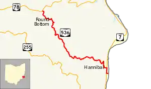 State Route 536 (SR 536) is a state highway in Monroe County, Ohio. At 12.58 miles (20.25 km) long, the highway runs from the West Virginia state line at the New Martinsville Bridge near Hannibal to SR 78 in Adams Township. The route south of the northernmost intersection with SR 7 in Hannibal is not signed by the Ohio Department of Transportation (ODOT). The route is signed and designated as a north–south route though the route physically runs northwest–southeast.
