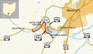 State Route 551 (SR 551) is an east-west state highway in southern Ohio. Its western terminus is at a T-intersection with SR 220 about four miles (6.4 km) southwest of Waverly, and its eastern terminus is at a T-intersection with SR 104 approximately two and a half miles (4.0 km) southwest of Waverly. Existing entirely within Pike County's Pee Pee Township, SR 551 follows the south shore of Lake White, while SR 552 follows the north shore. Lake White State Park is located near SR 551's western terminus.