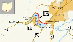 State Route 552 (SR 552) is an east-west state highway in southern Ohio. The western terminus of the route is at SR 220 about two and a half miles (4.0 km) west of Waverly. Its eastern terminus is at SR 104 nearly two miles (3.2 km) southwest of Waverly.