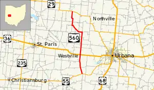 State Route 560 (SR 560) is a 9.97-mile-long (16.05 km) north–south state highway in the western portion of Ohio, a U.S. state. SR 560 has its southern terminus at SR 55 approximately 3.50 miles (5.63 km) southwest of the county seat of Urbana. The northern terminus of the state route is at a T-intersection with SR 29 nearly 6 miles (9.7 km) southeast of the hamlet of Rosewood.