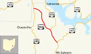 State Route 566 (SR 566) is a north–south state highway in eastern Ohio, a U.S. state. Located exclusively in northern Noble County, SR 566 has its southern terminus at SR 147, at a T-intersection 1.25 miles (2.01 km) north of the unincorporated community of Mount Ephraim. Its northern terminus is at another T-intersection, this time with SR 285 approximately 1.25 miles (2.01 km) south of the village of Senecaville.