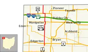 By 1957, SR 576 took on the shape that it has today, when it was extended northerly out of Montpelier concurrent with US 20A to US 20, then west along US 20 a short distance, and north over the former SR 571 to its present northern terminus at the Michigan state line.[5][6] The US 20A concurrency between Montpelier and US 20 was removed from SR 576 by 1964 when the alternate route to US 20 was re-routed to mainline US 20 via SR 15 to the east.[7][8]